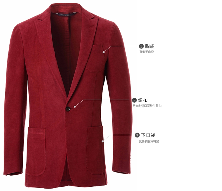 这套红色西装采用欧洲西服制作工艺,注重西服制作细节,不论是袖口,还是纽扣都采用**工艺制作,讲究制作流程,裁剪得体,设计出的每一套西服都**是精品中的精品。